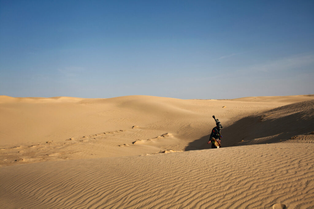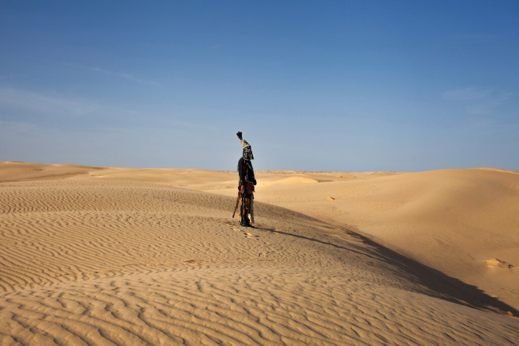 Il déambule dans les lieux qu’il représente (la forêt, le désert, la mer…) dans une quête identitaire, sur les traces des communautés noires du Maghreb.